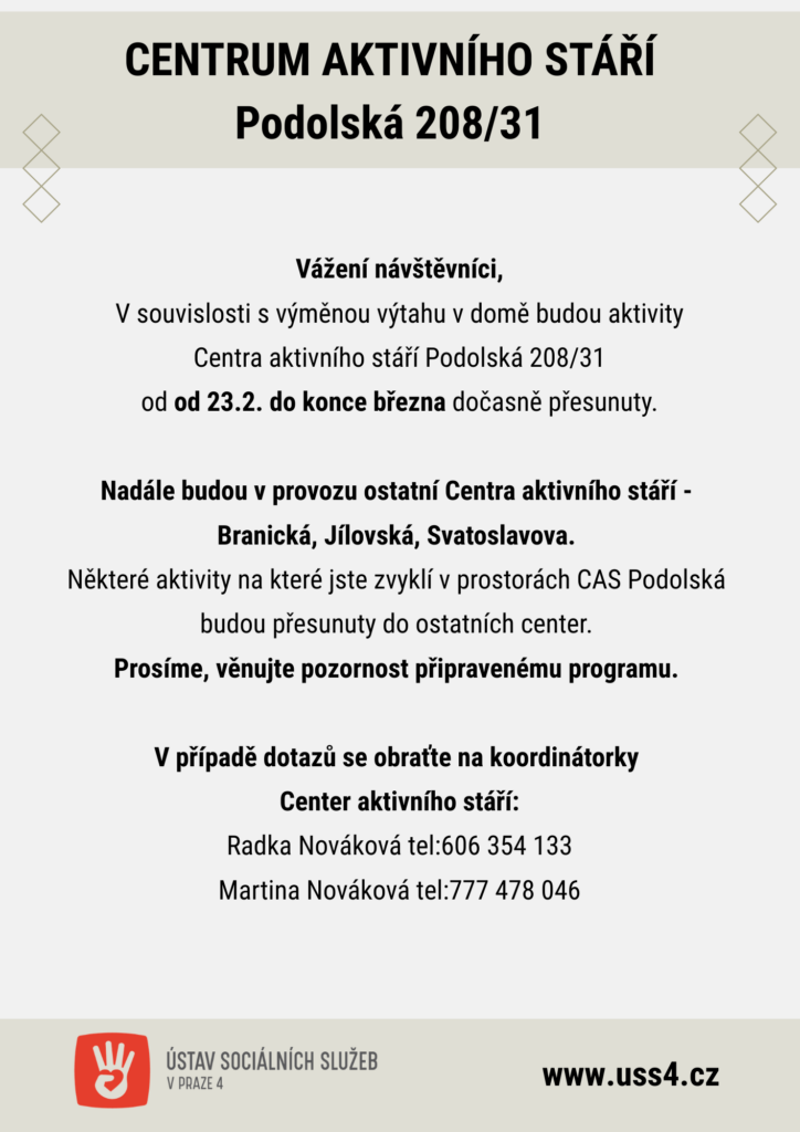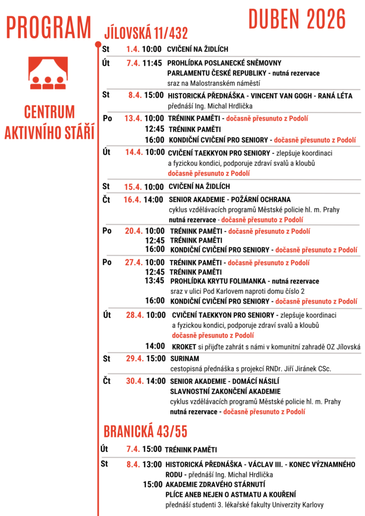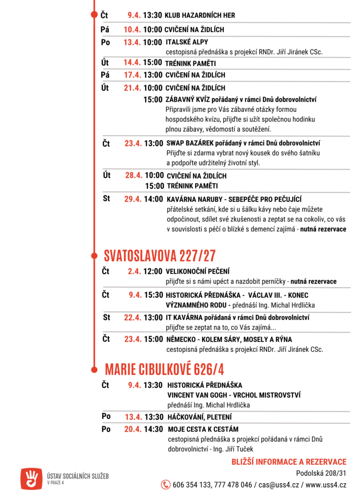 Program Center je každý měsíc aktualizován a najdete ho na webu www.uss4.cz nebo ho získáte u paní Novákové na adrese Podolská 208/31, Praha 4, tel. 606 354 133 nebo 777 478 046.